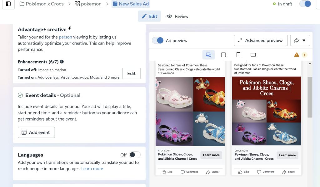 For this specific campaign, the most strategic way to post these ads would be on Instagram. In my opinion, this product is a extremely visual eye-capturing shoe. The product speaks for itself. Purchasing ad space on IG stories or on one’s feed. Targeting those who just finish digesting fashion or Pokemon content is optimal. One key aspect that is important to include is a CTA (Call-to-action) button to provide consumers with a direct link to purchase the Crocs.