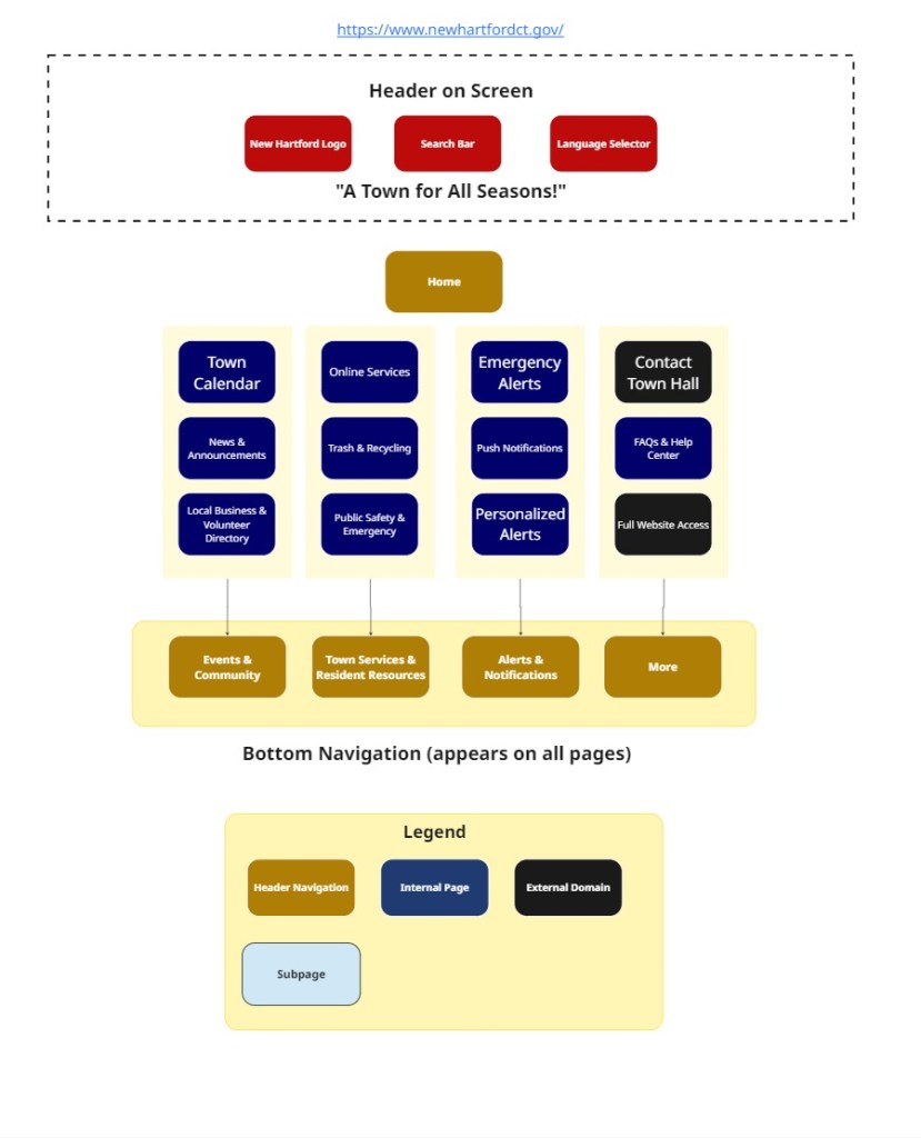 To build an app that truly serves its people (and in this case, its residents) community input is essential. It’s important to design technology that truly improves people’s quality of life, otherwise, new technology can have the complete opposite effects and cause more pain points for the user. With a well-planned app, New Hartford could expand their efforts to keep their community informed, engaged as well as connected. On a personal note, I found this activity quite challenging as it was hard to narrow down the mountains of information/features that towns are supposed to provide as they all “seemed” to be truly important pieces to a community. However, as a consumer I could also relate on the points of feeling overwhelmed and wanting the simplest route possible to my destination. Therefore, I found that juggling those two opposite points when designing the IA for the app.