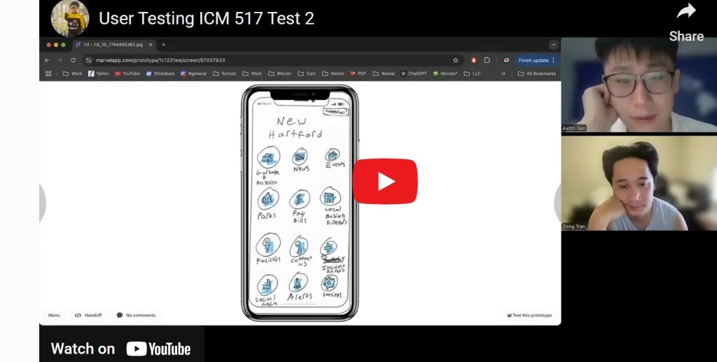 After developing a low-fidelity prototype of the New Hartford Connect app last week, it’s important to conduct usability tests with real users to see if the product in fact, does meet user needs. But what exactly is a user test? According to the Prototype User Testing Guide by UXTweak, “User testing is the process of evaluating a product by testing it with real users while Usability testing is the specific type of user testing focused on evaluating how easily users can learn and use a product to achieve their goals.”