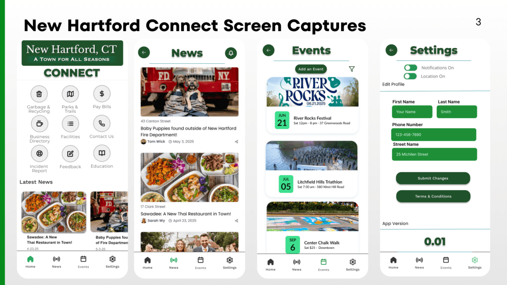 For this version of the New Hartford Connect Prototype, I decided to focus on the main bottom nav tasks (Home, News, Events, and Settings). After completing those primary pages, I took some time to build out some of the other action pages that could be possible with an app like New Hartford Connect.
