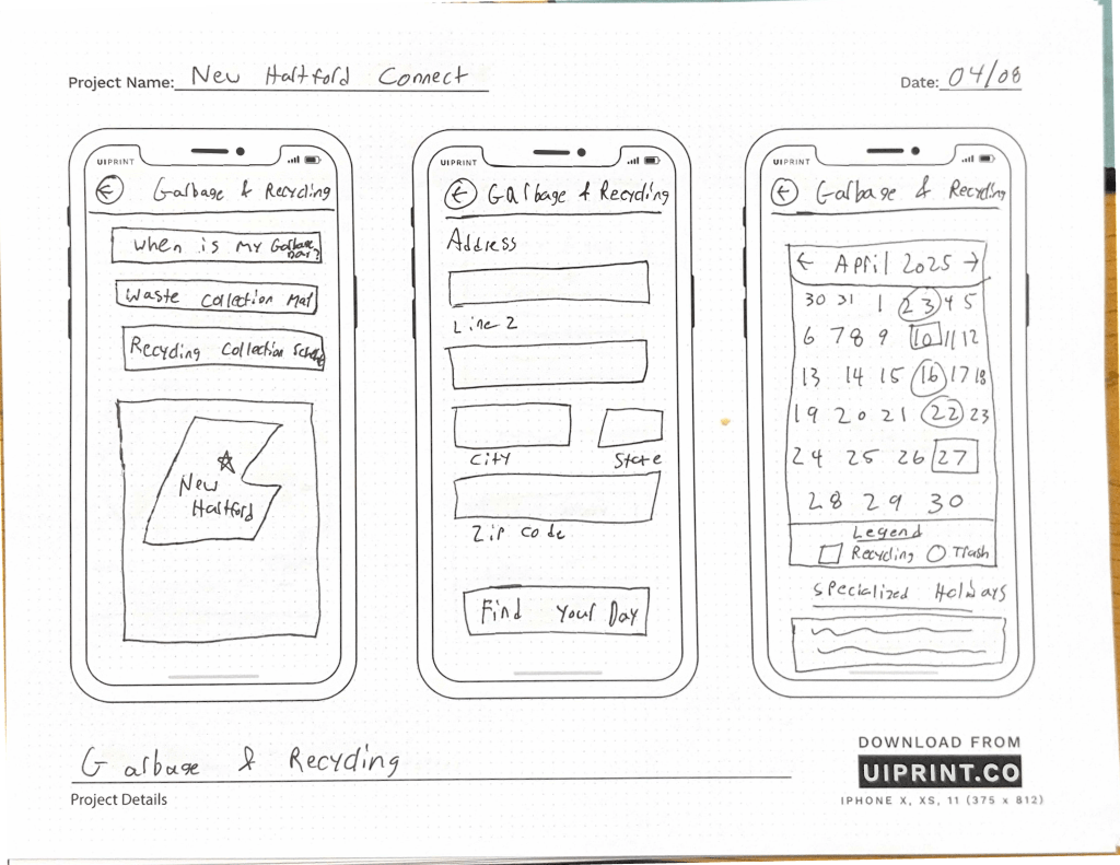In the final two weeks of the Ideation, Prototyping, and Testing course, a plethora of things need to be implemented. Feedback needs to be digested, changes need to be made from previous versions and further higher fidelity prototypes need to be built. Compared to the low-fidelity sketches that were made and tested a few weeks ago, high-fidelity and medium fidelity prototypes include more realism, higher details, and functional prototypes. The detail, accuracy, and realism of a prototype varies significantly based on the phase you are at on a project. When working on a product, prototyping helps designers provide a proof of concept that a design works as intended and determines if real users are able to use a product or not. After working and testing the first low-fidelity prototype of the New Hartford Connect app, an app designed for the residents of New Hartford to access the town’s services easier. It was finally time to expand on the feedback that I learned from performing user tests and revamp the design even further.