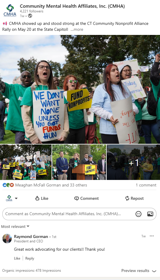 This week, I wanted to focus on my current company: Community Mental Health Affiliates. Community Mental Health Affiliates is a leading provider of integrated health and behavioral healthcare systems for children, families, and adults. Primarily located in New Britain, CT but serving towns across the state, CMHA serves over 7000+ clients each year through a multitude of programs. When I first arrived at CMHA as their primary social media guru, the organization was managing 4 social media accounts (Twitter, LinkedIn, Facebook, Instagram). After taking a deep dive into their analytics, I realized that LinkedIn was clearly their strongest platform out of the 4. LinkedIn manages to consistently gain the most followers and many of the posts that we create have higher engagements compared to the rest.