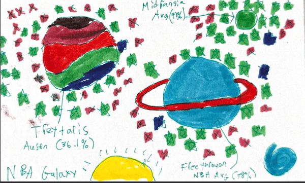 As I began this experiment, I realized that recording the data wasn’t the hard part for me, it was the aspect of thinking about the data in a more abstract way and finding a new way to visualize that took me the longest. To record all of my data, I used an app called Basketball Simple Stats and asked my girlfriend if she could keep track of all of the shots I took during the game. The app made it easy to track a shot with a click of the button and afterwards I was able to log down notes about the game as well. After thinking back and forth about it, I landed on a data visualization of “NBA Planets”. For a whole week, I tracked almost every 3-pointer, mid-range, and free throw I took. To put the shots onto paper, I turned each shot into a star and made them glow depending on if it were a miss, a make, an airball, or a wedgie. The results surprised me as I thought I’d shoot a better percentage on free throws since that was my strength but I actually shot a better 3-point percentage. As each of the stars surround the different planets: TreyTaris (3PT), Midrangia, and FreeThrowon, it was interesting to see the amount of shots I took for each. Overall, I found this exercise to be a lot of fun! It was interesting to think of a way to visualize data in a whole new light.