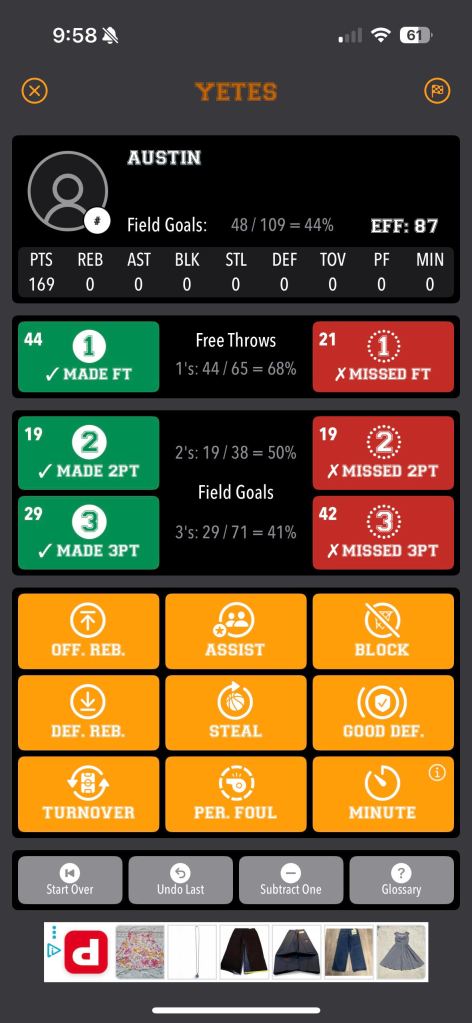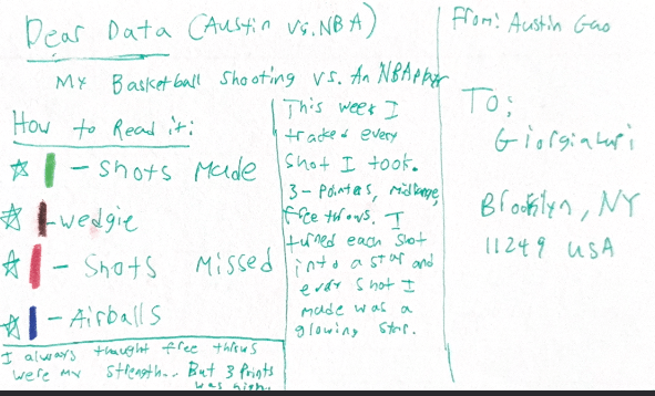 For my first attempt at making my own version of a Dear Data postcard, I honestly found it quite challenging. Since one of my recent hobbies has been playing basketball, I figured I could find and record massive amounts of data within a basketball session. During the 2024-2025 NBA season, NBA players averaged 36% 3PM (3-pointers made) and 78% Free Throws made. For this visualization, I wanted to see how large the gap was between a basketball player of my caliber compared to a professional. After deciding on a topic, I had to figure out what specific questions I wanted to answer.