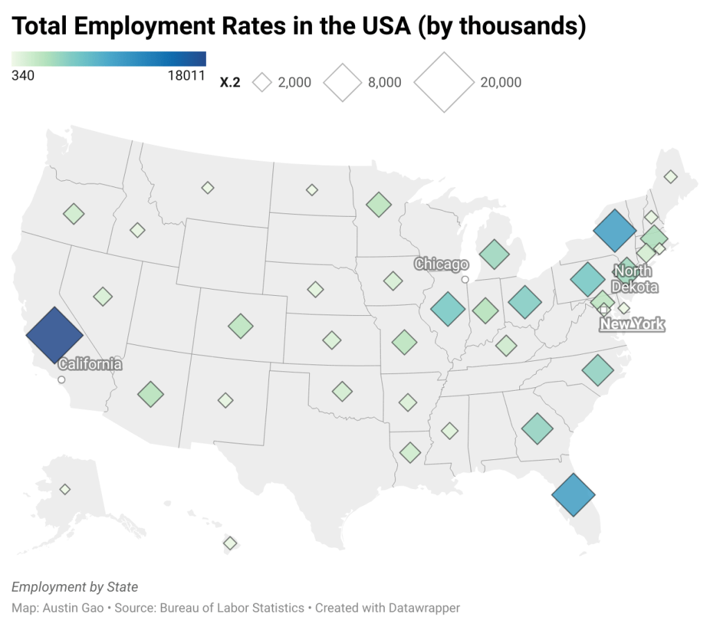 A Symbol map is interesting as it plots the value of the data variables proportionally depending on the kind of data you have. A famous example is the infamous election map which turns either red, blue, or a purplish color depending on the winner of election in that state. For my first symbol mockup in Datawrapper, I decided to highlight the Total Employment Rate across the United States for every 50 States. This map gave an excellent visualization of how many people are employed in every part of the country.