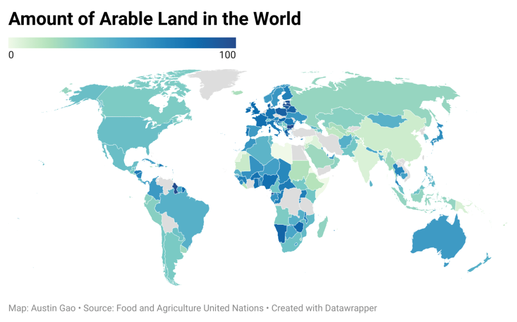 A Chloropleth map is primarily used to represent data variables such as densities, ratios, rates. An example of this map is the visualization of COVID-19 which showed the entire map of the United States and how dense the covid cases were depending on which county you hovered over on the map. For my example, I wanted to focus on the amount of land vs arable land that each country had. As a visual learner, it was fascinating to put all of this data into a visual form and it helped me see the bigger picture much better.