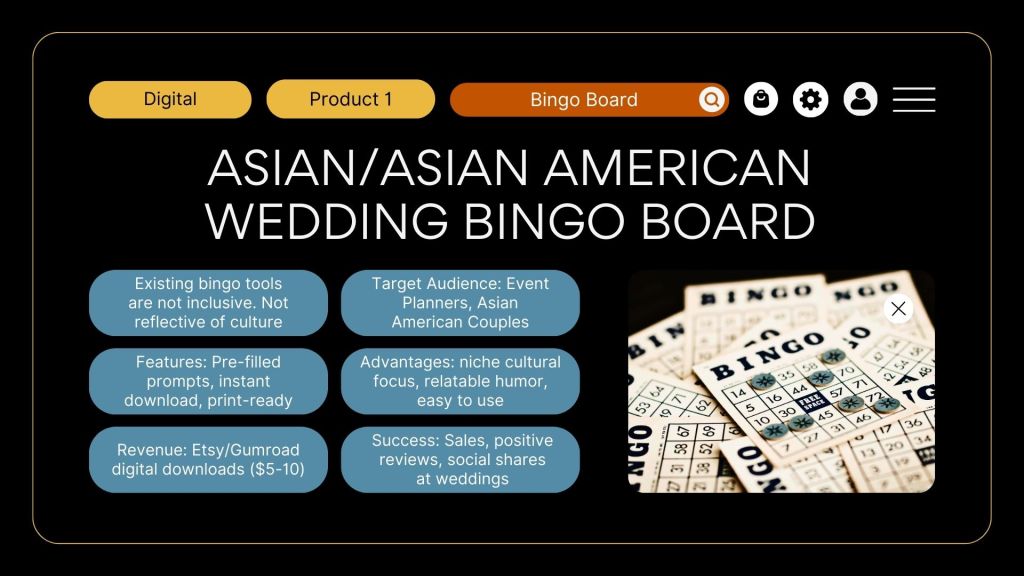 This week in Digital Product Design, my goal was to find the product idea that I wanted to focus on based on the market research I did last week. To accomplish that, I pitched my three original digital product ideas I developed last week which were a wedding bingo board specifically catered to an Asian/Asian American audience, a House Tracker spreadsheet on Notion that would make it easier for house hunters to budget and organize listings, as well as a Discord Meme Sound Effect Pack which includes the latest and greatest meme sounds to use for entertainment.