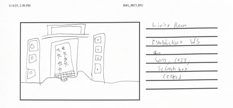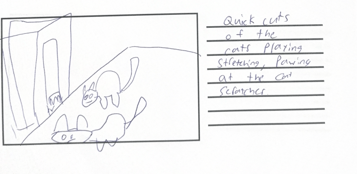Developing a video montage for next week’s production phase takes pre-planning! For this project, I wanted to highlight my two cats by creating a montage of them using their favorite cat scratcher, which coincidentally looks like a 3d model of a famous painting. Throughout the planning document, I included details such as the objective of the piece, summary of the storyline, as well as how long I believe the piece will be. I also logged a rough script that included potential sound effects (SFX) as well as a shot list of ideas that could be interesting to capture visually. Once the script was settled, I worked on storyboarding a few of the shots I had described in words into a “very” rough sketch of the shots I planned on taking.