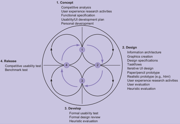 The Product Lifecycle is a model that describes the stages a product goes through from initial development of the product and all the way to the end of marketing/deploying the final version. Chapter 1 of Understanding Your Users explains that the selection of a methodology must be driven by where the product currently lives in its development. Throughout the product lifecycle, there are a plethora of different techniques, processes and methods that help ensure that the end product is focused on the user. The book also illustrates an ideal life cycle which includes 4 primary stages: Concept, Design, Develop and Release.