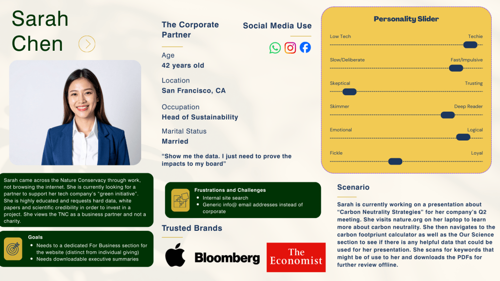 At the end, this project demonstrated that even the most mission-driven organizations must prioritize UX Design to achieve their goals. By aligning TNC’s business needs with the actual behaviors of its users, the website can become more than a brochure, but rather a powerful engine for global conservation and achieve greater things. Please feel free to browse the full document below for more information.