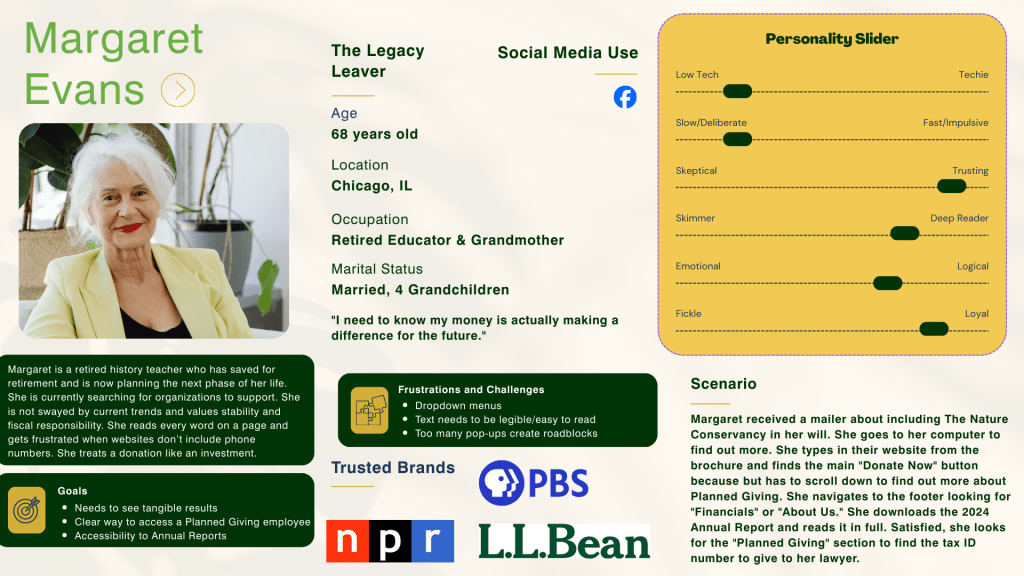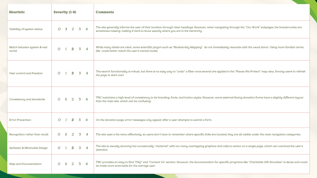 This semester-long research project focused on nature.org, identifying where the user experience (UX) succeeds in storytelling but falters in functional utility. The goal for this project was to streamline the path from visitor to supporter by identifying and removing digital pain points.