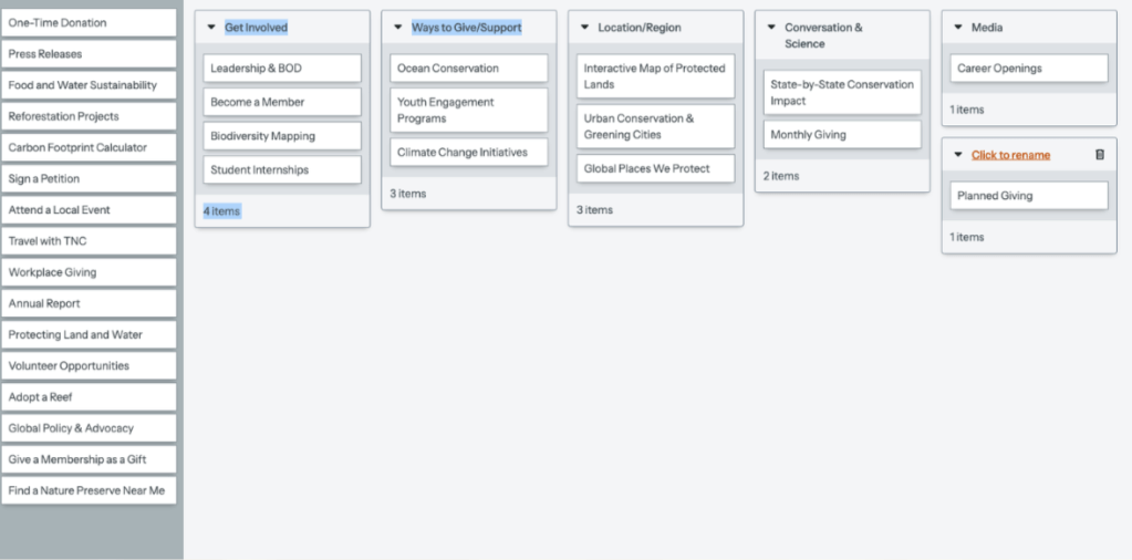 During testing, multiple users struggled to find the Annual Report. Despite being one of TNC’s most crucial documents, it was “hidden” under layers of navigation. This confirmed that the site’s Information Architecture was hindering one of its best engagement tools.