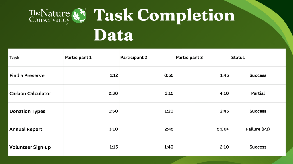 The most critical phase involved direct Usability Testing. Participants were asked to complete high-value tasks, such as finding a local nature preserve and locating the Carbon Footprint Calculator.