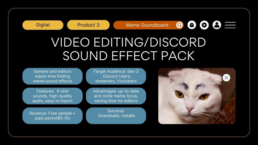 Early on in the process, I decided that I wanted to create something in the digital entertainment space — a playful product that was instantly usable and could be useful to a wider audience. That’s how I landed on the idea for the Meme Discord Soundboard (later refined into the Meme Video Editor Sound Effects Pack).