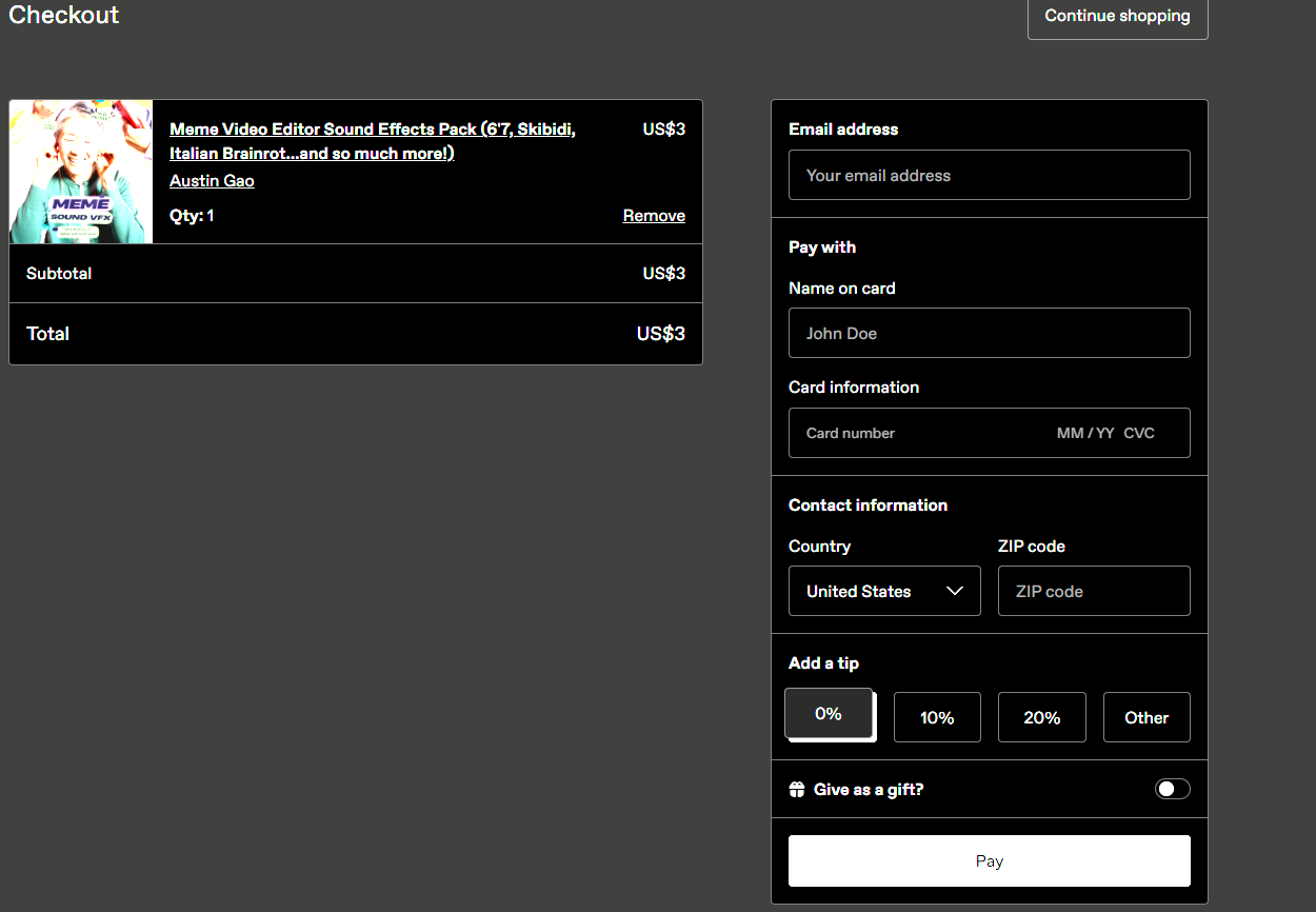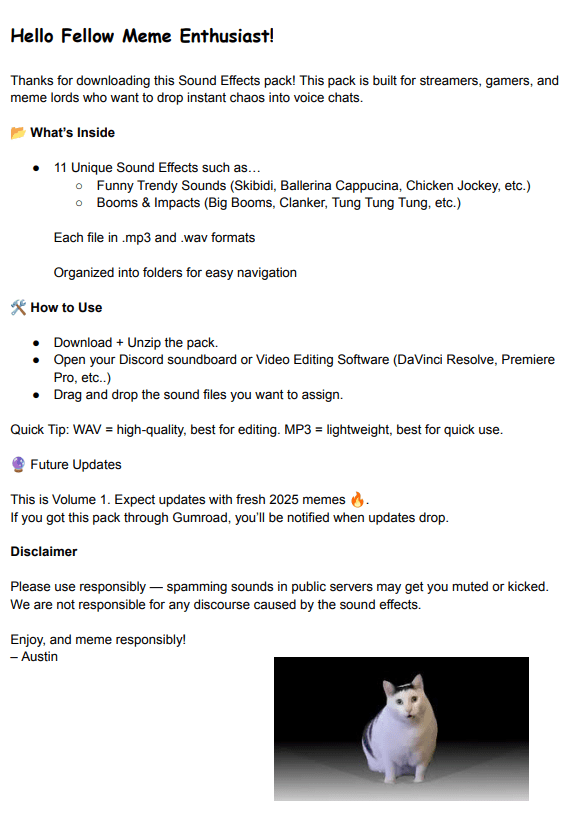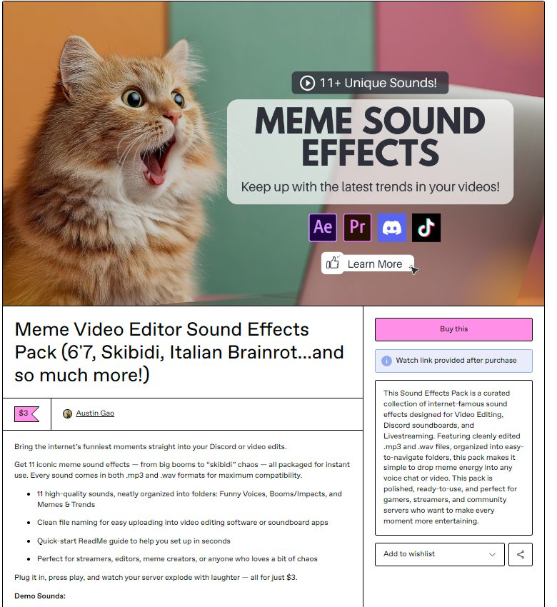 Built as a compact $3 digital product, it delivers 11 curated meme sounds — from Skibidi chaos to 6’7 brainrot — each available in .mp3 and .wav formats. Every file is cleaned, normalized, and neatly organized for instant use in Discord soundboards or video editing software.