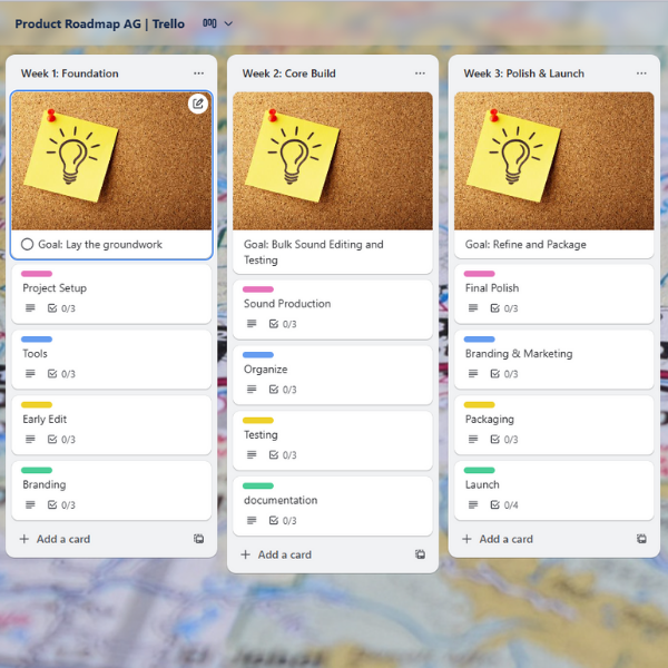 To stay organized throughout development, I built a Trello board to visualize each stage of production. Using Trello helped me track deliverables, link my working documents, and manage milestones week by week. It also provided a visual timeline that made the 7-week sprint more manageable and kept me accountable to each phase.
